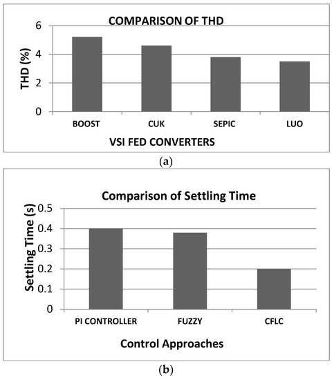 For significant enhancement of converter operation in terms of percentage THD, unity power factor, settling time, overshoot, steady-state error, rise time, etc., adopting a suitable controller is crucial. The conventional PI controller is the most desirable in the PV grid-connected systems since it is simple in design, regulates DC quantities and improves system performance [16]. However, it includes a non-zero steady-state error, performance deterioration during load changes, and difficulty in determining appropriate controller values due to non-linearity and changing operating conditions [17,18]. To address these issues, Artificial Intelligence (AI) techniques such as FLC or Neural Networks (NN) are used to control the switching operation of the converter. However, NN based control approach is computationally intensive and suffers from control complexity, especially in PV applications [19,20]. In order to address the aforesaid issues in the existing literature, this research paper proposes a Cascaded Fuzzy Logic Control (CFLC) to enhance the operation of a high-gain LUO converter and to effectively enhance the DC link voltage of the DC microgrid system. The proposed cascaded control approach is capable of managing disruptions and tackling problems related to non-linearity and uncertainty.
