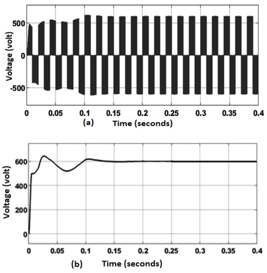 Figure 13. (a) DFIG-based WECS output voltage and (b) PWM rectifier output voltage.