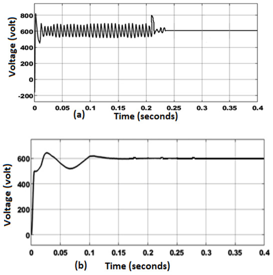 Figure 14. DC link voltage: (a) droop control without inertia and damping control and (b) droop control with inertia and damping control.