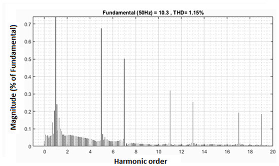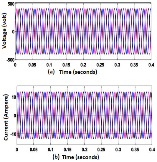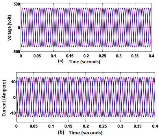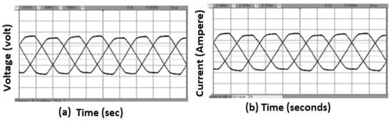 Figure 18. Waveforms of   3 φ   grid at reference power of 1500   W :   (a) Voltage and (b) Current.