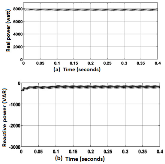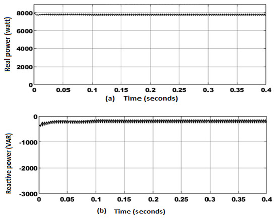 Figure 19. 3 φ   Grid at reference power of 1500   W :   (a) Real power and (b) Reactive power.
