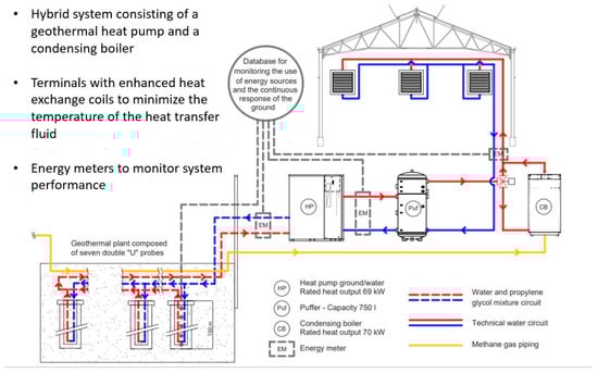 The aim of the study is to optimize both investments and operative costs, comparing with conventional heating systems. The plant is in a testing phase, and it will be operative from autumn 2023. In detail, a hybrid heating system, consisting of a condensing boiler to meet peak loads during colder days and of a shallow geothermal plant to meet the base load and the energy needs for most of the year, will be used. As represented in Figure 2, preliminary energy simulations of the greenhouse expect to almost meet the total energy need with only the geothermal heat pump, while using the condensing boiler only during some days in colder months to meet peak loads (about 3% of the total energy needs). This design was identified as a good solution to bear high costs for drilling and operative costs for gas, achieving high environmental and economic benefits.