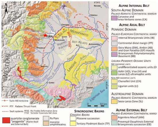 - Piana, F.; Fioraso, G.; Irace, A.; Mosca, P.; d’Atri, A.; Barale, L.; Falletti, P.; Monegato, G.; Morelli, M.; Tallone, S.; et al. Geology of Piemonte region (NW Italy, Alps-Apennines interference zone). J. Maps 2017, 13, 395–405. [Google Scholar] [CrossRef]