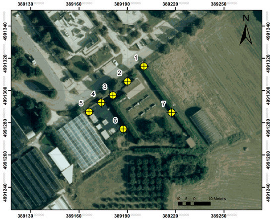 Aerial view of the designed BHEs, based on the available data from the previous field studies and on the requested energy needs. The yellow circles represent the BHEs. Number 1 refers to the pilot BHE used for field GRT (−100 m in depth); numbers 2–7 refer to the other BHEs at 150 m in depth.