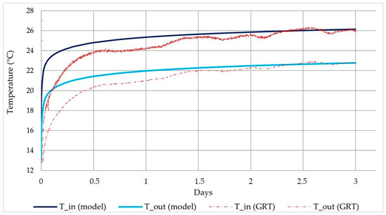 Inlet (Tin, °C) and outlet (Tout, °C) temperatures from the field GRT vs. simulated GRTs.