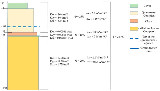 As described in the previous sections and represented in Table 1, the investigated site is characterized by two important geological units, including the “Quaternary” complex, consisting of conglomerates and gravels, and the “Villafranchiano” complex, representing a succession of clays and gravels with subordinate gravels and sands. These lithological characteristics have been differentiated in the numerical simulations through their different hydraulic heads in the X, Y, and Z directions, their different porosities and thermal conductivity values (Figure 6); all these data were achieved as close as possible to real parameters, thanks to an accurate calibration of the hydrogeological model.