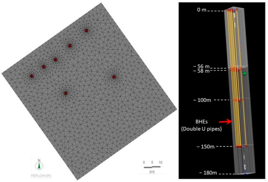Feflow software 7.0 (Wasy DHI Group, Berlin, Germany) was used; it is one of the most reliable finite element numerical codes and one of the most-used for these purposes. According to what was specified in [23,27], this software enables analyses of each part of the ground/aquifer/pipe system, as well as to obtain the amount of thermal power that can be extracted from the investigated medium using specific boundary conditions. These features allow a high level of numerical efficiency to be provided and, thus, an accurate sensitivity analysis. Furthermore, the software enables the use of several different calculation systems, each responding to specific model conditions. For this study, a calculation method suitable for symmetrical (flow) and asymmetric (transport) equations systems was used. Aimed at studying the heat exchange in the ground/aquifer/pipe systems, each simulation was characterized by a specific time step typical for transient conditions. The study area was then set, generating a finite-element mesh containing all the geometrical properties the mesh generation algorithm needs (a super-mesh). This 50 × 50 × 120 m mesh was characterized by an arbitrary number of polygons, lines, and points with a specified function [34]. The model was divided in five “slices” representing the top and the bottom of each considered layer. A punctual element, placed in the central portion of the mesh at −100 m in depth and equipped with a double U geothermal pipe, represented the pilot BHE.