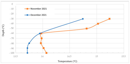 In addition, two different logs were accomplished in November (a few days after the drilling of the borehole) and December 2021, aimed at evaluating temperature of the water inside the geothermal pipe (Figure 9) using a Mini-Diver by Van Essen Instruments (range: −20 to 80 °C, accuracy: 0.1 °C, resolution: 0.01 °C). Both highlighted a change at about −60 m, representing the level at which the temperature values started to stabilize with the depth. This matches with the variations in the hydrogeological conditions due to the presence of the groundwater level at −58 m. The second log shows a temperature slightly lower than the previous one, according to the smoothing of the ageing effect of the grout that produced an increase in the ground temperature for some days.