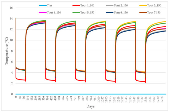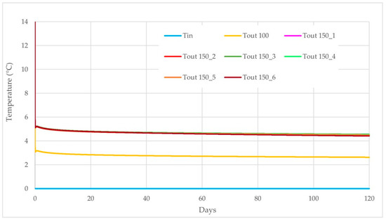 Refrigerant fluid at 0 °C was continuously injected into the inlet geothermal pipe while leaving the outlet pipes at the end of the simulated heating cycle at slightly different temperatures depending on the depth of the boreholes (Figure 10). Precisely, the pilot pipe used for the field GRT at −100 m deep recorded an outlet temperature of 2.63 °C, while the other geothermal pipes at −150 m deep displayed outlet temperatures ranging from 4.42 to 4.56 °C (Figure 10), with a greater temperature difference (Tin − Tout) than the pilot one. Furthermore, curves representing the six outlet pipes at −150 m overlapped, showing the same linear trend during the entire simulation time. Generally, after the first hours of operation, all curves showed a steep decrease, reaching temperature values very close to those recorded at the end of the simulation and, thus, maintaining a linear trend.