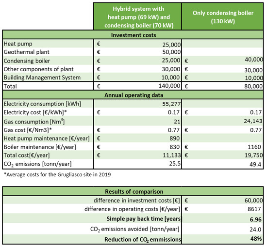 A specific economic analysis (Figure 14) based on the costs before the year 2022 and, thus, before the current European geopolitical situation, was also conducted. The design of the shallow geothermal plant, as presented in the previous chapters, allowed the right number of the geothermal boreholes (BHEs) to be deduced, as well as their depth and their distance, while limiting the initial investment costs and meeting almost all the energy needs. The economic analysis has provided how much of the initial costs can be retrieved; the payback time for the realization of the entire hybrid system has been evaluated to be seven years. These data clearly vary because of the current instability of the energy market, for which it is very difficult to perform a correct economic evaluation in such a volatile situation. Furthermore, the designed hybrid system allows a strong reduction in CO2 emissions (about 50%), proving the great benefits of this heating system in terms of energy and cost savings.