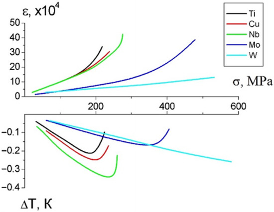 Dependence of deformations ε and temperature changes ∆T of samples on mechanical stresses σ [31] (the temperature is measured by additional thermocouple touched to the sample).