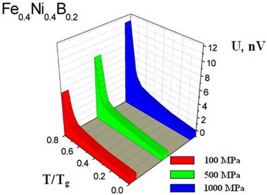 Temperature dependencies of the thermo-EMF drift U of metallic glasses on tensile forces 100, 500, and 1000 MPa (here Tg is the glass transition temperature) [16].