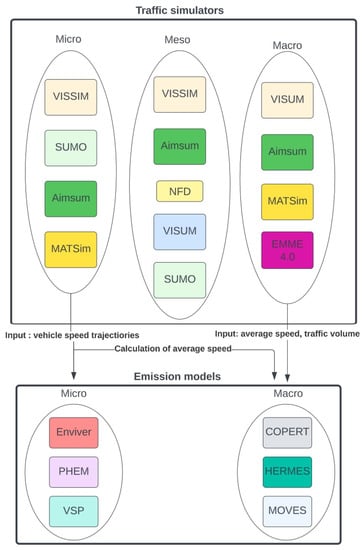 - The combination of emission models and simulation models is not always at the same scale, and it is often possible to find work that uses micro-scale traffic models while using macro-scale emission models for emission estimations.