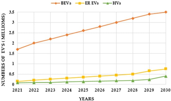 The effects of global warming and abrupt climate change have been the primary concerns of environmental experts when combustion engines are being used [1,2]. The majority of studies have focused on the benefits of avoiding the further use of internal combustion engines, and now the trend of vehicle design is switching to electric vehicles (Evs) in order to reduce carbon emissions, safeguard against climate change and reduce global warming [3]. The transportation sector is the main source of contributions to recent worries about pollution and rising fuel consumption [4]. The use of Evs has been heavily encouraged over the past ten years, as suggested in [5]. Consequently, Evs’ growing popularity in the market has encouraged the development of other varieties of Evs, such as battery electric vehicles (BEVs) [6], hybrid vehicles (HVs) [7], fuel cell electric vehicles (FCEVs), and extended-range electric vehicles (ER-Evs) [8] for future exploration. Navigant Research has forecast a robust trend for global yearly EV adoption, as shown in Figure 1. It has identified a consistent increase in global EV integrations. In addition, the report in [9] projected that over 26.8 million BEVs will be sold globally between 2021 and 2030 [10]. However, this growing deployment of Evs will create a continuous rise in the charging load demand in electric grid networks [5]. This future deployment of Evs has positioned grid stability for EV fast-charging stations (FCSs) as the new focus for discussion [9,10] and research.