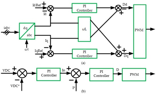 This technique is implemented in the rectification stage for voltage gain improvement and high efficiency [45], as shown in Figure 8a. The instantaneous power and voltage components are matched for a stable DC-link voltage and to synchronize grid current and voltage for the same phase and frequency alignment at the PCC [46]. Grid current (iabc) is deployed for current control implementation in the rotating direct-quadrature (dq) reference frame [46]. The DC-to-DC converter control is implemented using an isolated or non-isolated converter in this strategy, where the phase shift between the voltages, duty ratio (D) of the voltages, and the frequency of operation can be controlled using either a PI or DB controller for transient DC current reduction, as shown in Figure 8b [47]. The inner-loop current’s reference value (In) is generated by the first PI controller and is compared with the reference current (I*) in the inner-loop control, and this is fed to the second PI controller to generate the switching pulse to stabilize the DC output voltage [36]. The technique only processes a fraction of the total power requirement percentage of the EV load [45,46,47].