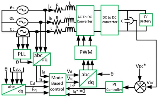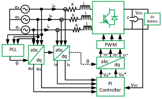 This strategy is achieved in the rectification stage by using voltage-oriented control to apply a discontinuous control signal to maintain the dynamics of FCS control when variations happen to the EV load [49]. In order to keep the input power factor at unity, the inner loop uses MBC to regulate the direct and quadrature components of the line current in the rectification stage [50]. At the same time, the PI controller is used with the MCB strategy to regulate the DC-link voltage at the reference value in the DC-to-DC converter stage, as shown in Figure 9. This approach incorporates the input voltage feedback signal [49,50]. This feedback signal is used to provide a reasonable level of control effect whenever there are sudden changes in FCS operation [51]. It disallows the transient component of oscillation by preventing the slow response caused by changes in the load pattern at the PCC [52]. The MBC strategy is characterized by its ability to lower the transient characteristics and increase the system’s stability under nonlinear load circumstances [49,50]. However, the MCB strategy has been reported in [50,52] to show negative incremental impedance at a constant EV load, and this will compromise the FCS and grid stability at the PCC. In a related development, the observation in Figure 9 shows that and are the controller’s reference current values for the direct (d) and quadrature (q) components, respectively, with respect to the reference direct current () values. In view of this drawback in MBC, filter-based control is often seen as a viable alternative and this will be discussed in Section 2.3.