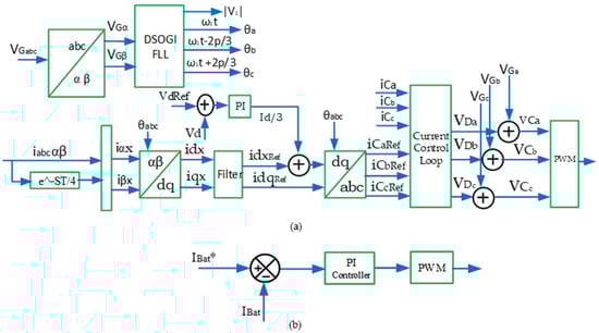 This control strategy is executed in the rectification stage via either hysteresis or voltage-oriented control, depending on the type of filter [35,53]. This concept was applied in [54] for a three-phase supply to improve the system’s resistance to harmonic grid voltage and unbalanced loads in the rectification stage. However, this strategy is sometimes unable to respond to practically opposite circumstances during voltage tracking [55]. To overcome this challenge, as shown in Figure 10a, the double second-order generalized integrator-frequency locked loop (DSOGI-FLL) algorithm was used to calculate the grid voltage based on the measurement of grid voltages (VGabc) [56]. Similarly, in the DC-to-DC stage, this control strategy managed the power exchange between the DC-link voltage and the EV battery by comparing the output load current (IBat) and the reference load current (IBat*) to give the switching control signal to the DC-to-DC converter, as shown in Figure 10b [53]. In the DC-to-DC stage, a filter may also be deployed to reduce the switching noise that returns to the power source, as well as the high-frequency noise that comes from the power supply [55]. The first positive sequence harmonics components of the grid voltage’s amplitude (|V1|) and angles (θa, θb, θc) are computed to guarantee the transformation of load currents for each converter phase individually [53,54,55].