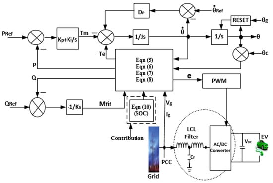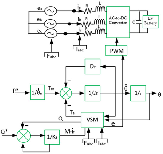 In a related development, the authors in [78] presented a different control approach for DC-link voltage and ripple current cancellation for the rectifier DC output. This control strategy was able to maintain the soft switching of both AC-side and DC-side switches across the voltage grid cycle at the PCC for different load conditions [75,78]. However, a major drawback of a slow response was observed in [74,78] under increased EV loads, but this shortcoming was suggested to be due to the PI controller [74,75,76]. In the case of VSM, as shown in Figure 12, where it is deployed to mimic a VSM’s performance, it offers a controlled power factor and stabilized supply frequency irrespective of changes at the PCC [80]. This control strategy ensures frequency and power control by using the virtual amplitude compensator (VAC) [81]. This approach is often deployed with a PI controller to achieve a margin of stability in a weak grid scenario via the virtual shaft angle with frequency adaptation, and to update the filter coefficient of synchronous frequency for frequency regulation at the PCC [82].