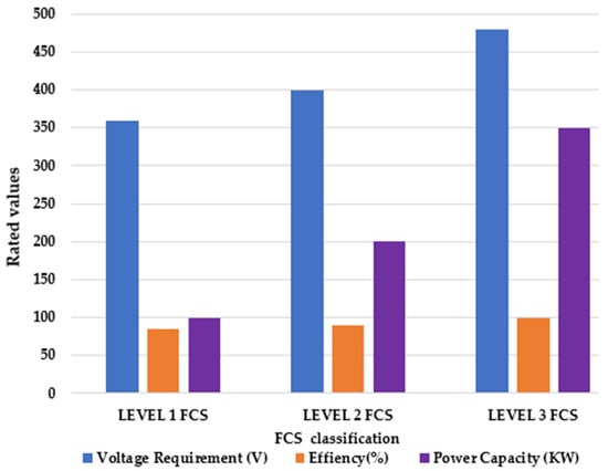 The FCSs are divided into three categories [18,19]. The first is level-one chargers, which have the capacity to offer between 50 Vdc and 500 Vdc with a maximum charging current of 125 A [19]. Level-two chargers are characterized by 410 Vdc with up to 300 A charging current [19,20]. Level-three chargers can accommodate over 800 Vdc with a corresponding charging current of 370 A, as shown in Figure 3 [20]. Recently, the authors in [20,21] reported an improvement in the rectification stage of the FCS by using the Swiss rectifier and the Vienna rectifier, respectively. These two approaches showed the reduction in harmonics in the line current (6.60%) when applied to a single-stage converter-based FCS. However, the drawbacks, as reported in [21], are the severely restricted reactive power generation and phase displacement angle between current and voltage waveforms. These drawbacks prevent the rectifier from functioning at the unity power factor, as observed by [22].