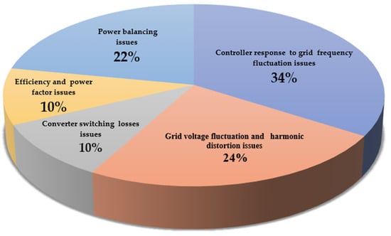 The FBC’s overall parameter performances are tabulated in Table 5. The table showed that the PI controller was deployed in [95,121] for current control and voltage control, and the DB controller was used in [19] for current control and voltage control. The PID controller was deployed in [119] for current control, voltage control, and power control, and the PR controller was used in [122] for current control and voltage control. The authors in [19,95,119,121,122] were able to achieve PF values of 0.7, 1.0, 0.828, 1.0, and 0.9, with corresponding values of CTHD of 4.68%, 2.34%, 24.82%, 14.6%, and 4.8%, respectively. It is important to note that the authors in [95,121] achieved unitary PF values, which could be attributed to the grid support offered by the double close loop control in [95] and the energy support system (ESS) in [121]. The CTHD and PF values in [119] were quite outside the recommended values of IEEE Std. 519 of ≤5% for CTHD and ≥0.9 of power factor.