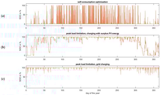 Sample battery states of charge (SOC) over one year for self-consumption optimization resp. peak load limitation for a residential neighborhood with charging infrastructure, PV system, and battery storage system (simulation results, see application example 1 in Section 2.3). (a) Self-consumption optimization; (b) peak load limitation—charging with surplus PV production; (c) grid charging. Surplus PV production is not sufficient for year-round peak load limitation. When charging from the grid, the battery is usually fully charged and not used to capacity. Furthermore, peak load limitation is also not ensured during self-consumption optimization.