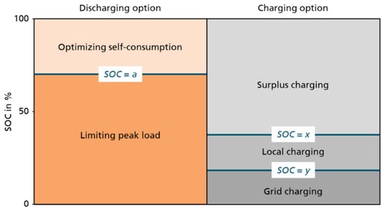 When applying the new operating strategy, both the discharging and charging processes can be changed depending on the SOC of the battery (Figure 2). Different SOC limit values are defined for these operating changes. If these are exceeded or undershot, the operation in question is changed. These limit values are referred to below as Change SOCs a, x and y (in % SOC) and feature the following characteristics: