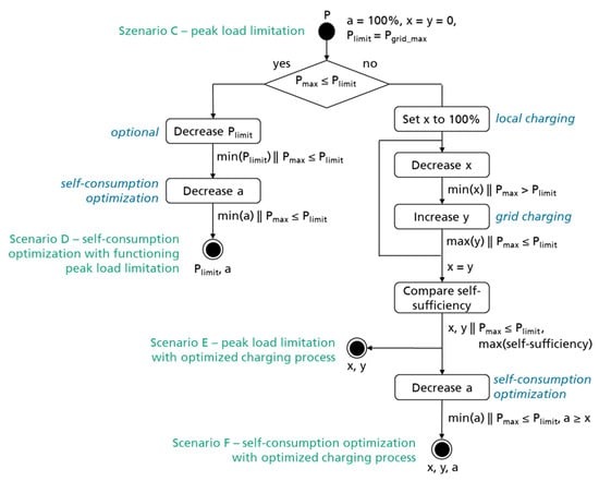 Starting from scenario C, the values for x and y are varied in discrete increments (e.g., in ±10% increments) as follows and a simulation is performed in each case: When y = 0%, x is gradually decreased from 100% until the peak load limitation is no longer reliably maintained on a permanent basis. This x value is used to gradually increase y until the peak load limit is maintained once more. Once this y value is reached, the x value decreases even more. This sequence continues until x = y. All value pairs which cause the peak load to be exceeded are discarded. One of the remaining x and y pairs leading to the highest degree of self-sufficiency represents the optimum for this scenario. The value for a remains at 100%. Optionally, scenario E can be executed without grid charging (y = 0% on a permanent basis) or starting with local charging in scenario C. If a functioning peak load limitation is achieved, self-consumption can be optimized as described as follows in scenario F.
