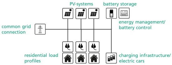 This scenario describes a residential neighborhood with 30 residential units and a shared underground garage (Figure 4). PV systems for local use are installed on the residential buildings. These systems are operated in combination with a common battery storage system. The neighborhood has a common grid connection which defines the maximum reference power. The underground garage is equipped with a charging infrastructure for electric vehicles. The load profiles of all components were simulated in one-minute resolution with MATLAB/Simulink 2015b over the course of a year. The basic simulation methodology is described in more detail by Göhler et al. [10].