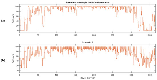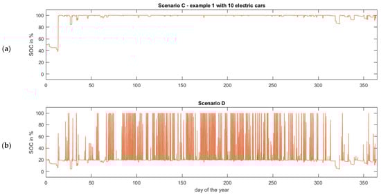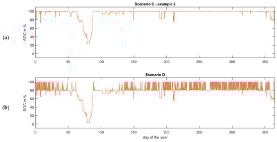 Due to the lower number of electric vehicles, peak load limitation with the battery can be guaranteed throughout the year even with a 17% reduction in the grid connection (Table 2). As high load peaks occur only rarely, the states of charge of the battery remain very high even in winter with the “Limiting peak load” operating strategy (scenario C, Figure 6a). Despite the starting value of 50%, the average SOC is over 97%. With just two full cycles a year, the battery is not used anywhere near its full capacity. With the new operating strategy, the battery can primarily be used for self-consumption optimization (scenario D, Figure 6b). This enables the degree of self-consumption to be increased by 25% to 0.85, placing it just slightly below the figure for the “Optimizing self-consumption” operating strategy but with reliable peak load limitation.