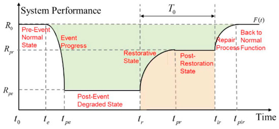 where F(t) is the system performance [4]. In the restoration problem, the resilience can be improved by restoring the system as fast as possible. Accordingly, by defining the system-performance function as the sum of the prioritized loads in service, i.e., , the system resilience can be calculated as (2) [4].