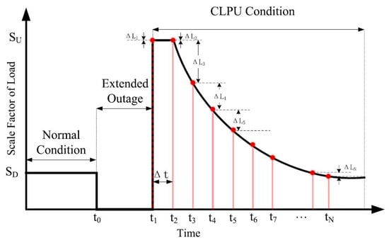 where is the time constant of the CLPU model, is the step function, and is the duration between the time step that the load starts gaining diversity and the tth time step. Using this information, the active and reactive power of the load can be calculated under the CLPU condition in an accumulative manner. To do so, can be replaced with and by choosing the corresponding undiversified and diversified loading factors for the active and reactive powers of the load, respectively. Then, the active and reactive powers of the load considering CLPU are calculated in a cumulative way using (11).