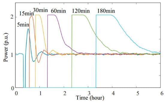 It should be noted that these calculations are applicable when there is an extended outage in the system, meaning that the diversity of TCL operating states is completely lost, and the TCLs have the same initial operating state. However, with the emergence of advanced distribution-management systems (ADMS) and using distributed energy resources along the system to enable the black-start and self-healing capabilities of the system, the outage systems may be restored soon after an event happens. In this situation, the CLPU curves of the loads are dependent on the outage time, as shown in Figure 3. In this regard, a time-dependent CLPU model was proposed in [21] to represent the actual dynamic behavior of the loads in the system.