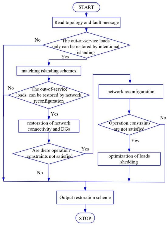 - Wang, F.; Chen, C.; Li, C.; Cao, Y.; Li, Y.; Zhou, B.; Dong, X. A Multi-Stage Restoration Method for Medium-Voltage Distribution System With DGs. IEEE Trans. Smart Grid 2017, 8, 2627–2636. [Google Scholar] [CrossRef]