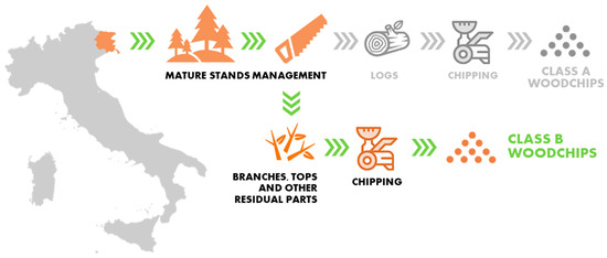 A specific case study in Italy, analyzed in the framework of the ARCADIA project (“Life cycle approach in public contracts and Italian LCA database for the efficient use of resources”) [34] financed by the 2014–2020 National Operational Programme on Governance and Institutional Capacity [35], was considered to model the production of the forest woodchips.