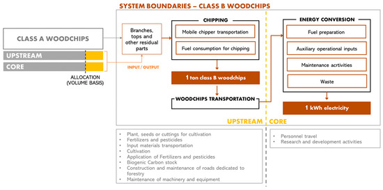 With regard to the CORE phase, forest woodchips are supposed to be used in a CHP plant for the generation of high voltage electricity. According to the specific PCR [39] recommendations, business travel of personnel, travel to and from work by personnel and research and development activities were not included in the system boundaries. CORE infrastructures were instead considered in the LCA and modelled through background data (dataset of the ecoinvent 3.9 database [47]), as well as other auxiliary operational inputs, fuel preparation processes at plant, maintenance activities and core waste management. According to the ecoinvent dataset, the CHP plant is equipped with a woodchips furnace with silo (5000 kW), an ORC heat and power co-generation unit (1000 kW electrical) and an electrostatic precipitator for particulate matter emission reduction.