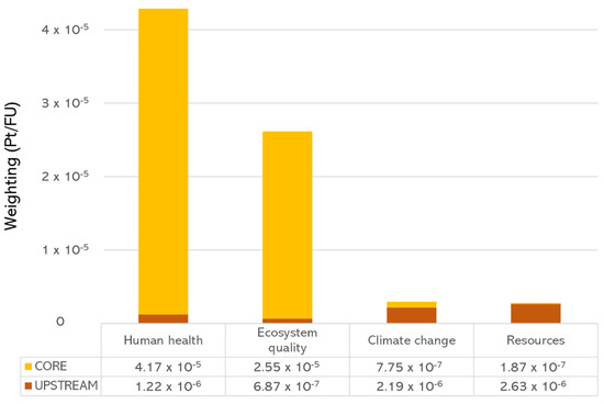 As shown in Figure 3, the most relevant categories are “Human health” and “Ecosystem quality”, respectively, with about 57% (4.29 × 10−5 Pt) and 35% (2.62 × 10−6 Pt) of the overall impact, while the share of “Climate change” (2.97 × 10−6 Pt) and “Resources” (2.82 × 10−6 Pt) is both about 4%. It is also clearly evident that the CORE phase is the most significant, being the main factor responsible for the impact related to “Human health” and “Ecosystem quality” (about 97% in both cases), mainly because of the direct impacts related to the energy conversion process (emissions and waste). On the other hand, the UPSTREAM phase is particularly relevant for the categories “Climate change” and “Resources”, with a contribution to their impact values, respectively, equal to 74% and 93%.