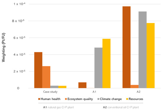 In comparing the case study to conventional fossil fuels at the endpoint level, it is evident that the overall impact is significantly lower than the natural gas (A1) and oil (A2) cases. In particular, with 7.48 × 10−5 Pt/kWh, the electricity generation by forest woodchips has an impact 34% less than its generation by natural gas and 72% less than its generation by oil. It is also clearly evident that the use of forest woodchips is characterized by a negligible impact in the categories “Climate change” and “Resources” compared to natural gas and oil (Figure 4). These categories, in fact, represent together about 8% of the overall impact in terms of damage points in the case study, while they account respectively for about 42% and 51% in the natural gas case and about 34% and 29% in the oil case. Focusing on the latter it is also worth noting the relevance of “Human health”, with a contribution of about 36% of the total damage points.