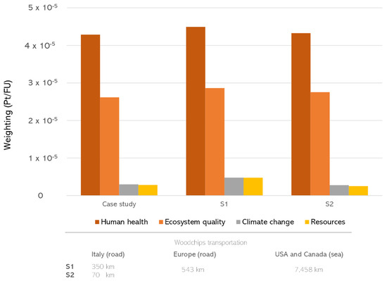 The comparison of different scenarios regarding woodchips supply and, in particular, considering the supply of woodchips for a 10% from abroad (8% Europe, 2% USA and Canada) and for a 90% from Italy, from a distance respectively of 350 km in S1 and 70 km in S2, highlighted a general small increase in the impact on “Human health” and “Ecosystem quality” (respectively, about +5% and +10% in S1, and about +1% and +5% in S2). It was therefore evident that the nature/characteristics of the used woodchips and the transportation mode/distance can play a not negligible role in determining the overall impact affecting these two relevant categories. At the same time, it was even more evident the role of transportation in terms of “Climate change” and “Resources” impacts, with an increase, respectively, of about +61% and +69% in S1 and a reduction of about −7% and −11% in S2.