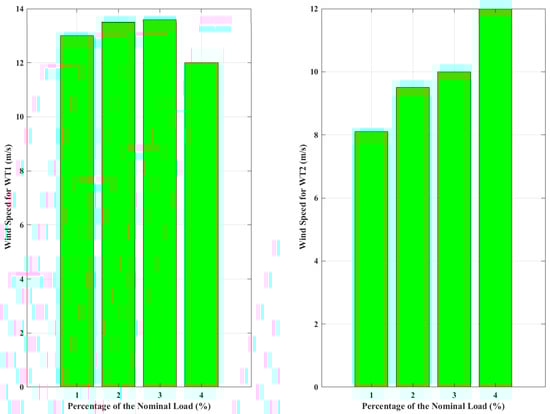 where and are constant and variable cost of PV generation units and is the maximum output power pf PV units. Furthermore, the output power of wind turbines depends on wind speed. The wind speed variations can occur on an instantaneous, hourly, daily, and seasonal basis. Therefore, Equation (4) is used to model the actual power generated by a wind turbine [29].