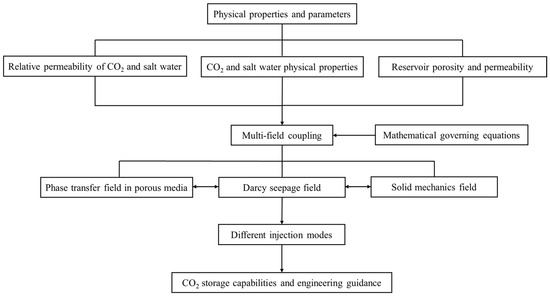 This study fully considered the physical properties of the reservoir and fluid. Multi-fields mainly include multiphase transfer field, Darcy seepage field, and solid mechanics field. The coupling method is introduced in detail in the mathematical model. Figure 1 is the flow of the process.