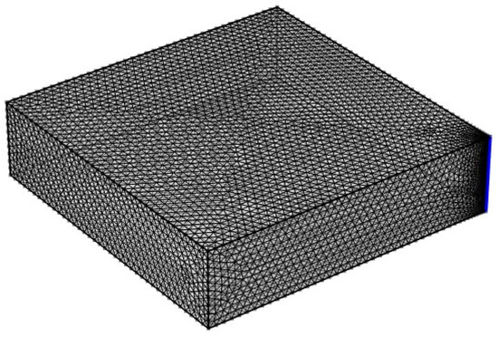 This multi-field coupling model employs the finite element method (FEM, COMSOL) to numerically solve the aforementioned equations. As illustrated in Figure 2, the geometric model dimensions are 2400 m × 2400 m × 300 m. A 1/4 symmetrical structure was utilized for the study. Our research hypothesis involves incorporating roller supports around and at the bottom of the reservoir to restrict normal movement. The upper surface of the reservoir is free, and the outer boundary serves for outflow. No flux is present at the boundary, the internal boundary of the reservoir, and the upper and lower boundaries. FEM calculations were executed based on the mathematical and physical models, with grid divisions as depicted in Figure 3. The total number of units is 242,895, and the grid around the well is dense. The maximum element size is 31.8 m; the minimum element size is 6 m; the maximum element growth rate is 1.13; the curvature factor is 0.5; the minimum element quality is 0.1842; the average element quality is 0.6632; and the overall quality of the grid is good.