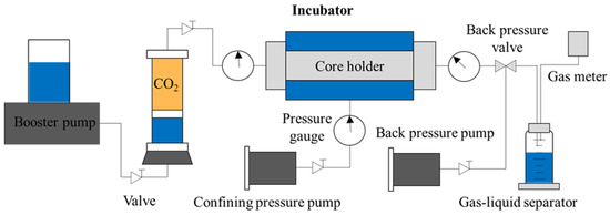 Figure A1 shows the experimental equipment, and it mainly comprises a booster pump, pressure gauges, incubator, core holder, confining pressure pump, back pressure pump, intermediate containers, and gas–water metering device. The experimental procedure is as below: