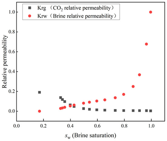 Figure 4 illustrates the experimental system designed for testing the relative permeability of supercritical CO2–brine. The system comprises a CO2 storage tank, booster pump, pressure gauge, incubator, core holder, confining pressure pump, back pressure valve, back pressure pump, gas–liquid separator, and gas–water metering device (Appendix A shows the experimental equipment and procedure). The experiment simulates a temperature of 70 °C (temperature of the reservoir), with inlet and outlet pressures set at 10 MPa and 8 MPa, respectively. Under these conditions, CO2 attains a supercritical state. Figure 5 illustrates the result of relative permeability.