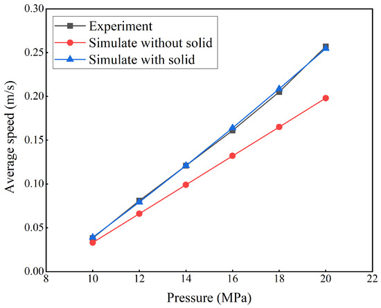 Figure 11 illustrates the relationship between the average core flow velocity and pressure for three experiment cases: one without considering solid mechanics, one considering solid mechanics in simulation, and one with experiments. We observed that simulations considering solid mechanics align closely with experimental results. However, simulations neglecting solid mechanics introduce increasing errors as the pressure rises. Therefore, to ensure simulation accuracy, accounting for the influence of rock mass solid mechanics is essential. According to Equation (15), as the pressure increases, the permeability increases.