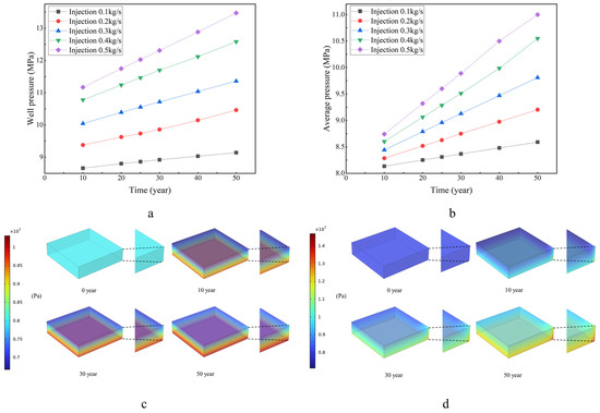 Figure 12c,d depict pressure cloud diagrams with injection rates of 0.1 kg/s and 0.5 kg/s, respectively. The pressure in the reservoir rises annually with injection, and the pressure around the well is notably higher than in other locations. Due to the influence of gravity, the pressure value in the lower layer of the reservoir is higher. Key findings for different injection rates after 50 years include: