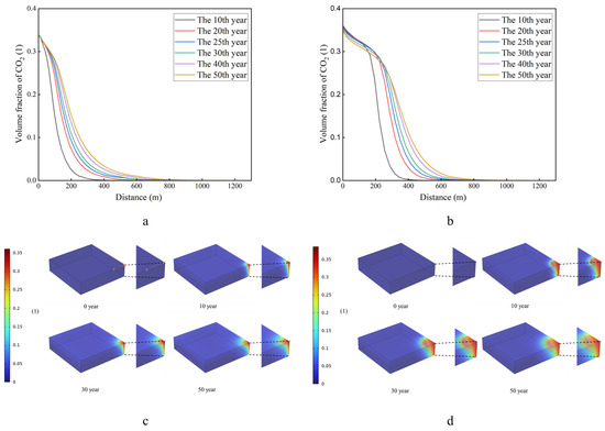 In this section, we discuss the CO2 distribution. Figure 14 shows the distribution of CO2 injection volume and rate. Figure 14a shows the distribution of injection rate 0.1 kg/s CO2 over time. Figure 14b shows the distribution of injection rate 0.5 kg/s CO2 over time. Figure 14c shows the distribution cloud diagram of CO2 with an injection volume of 0.1 kg/s; Figure 14d is the distribution cloud diagram of CO2 with an injection volume of 0.5 kg/s. We can find that as the injection time increases, the diffusion range of CO2 becomes larger and larger, and the concentration of CO2 on the diffusion path becomes larger, and the maximum concentration is around the well. And, the greater the injection rate, the wider the diffusion range and the higher the concentration. As the diffusion range increases, the concentration of carbon dioxide becomes smaller and smaller. When the volume fraction of carbon dioxide is less than 1%, we consider it to be no longer diffusing. Due to the effect of gravity, the CO2 concentration in the upper layer of the reservoir is greater than that in the lower layer and is distributed in a circular cone. For the five injection rates of 0.1–0.5 kg/s, the maximum diffusion ranges are 596 m, 608 m, 622 m, 621 m, and 640 m, respectively, in 50 years (The distance between the uppermost layer of the reservoir and the well is marked by an orange double arrow). For the other six injection modes, the CO2 distribution is shown in Figure 15. As the injection time increases, the CO2 diffusion range increases year by year. The maximum concentration is also around the well and occurs in the year of maximum injection volume. The diffusion ranges under these six working conditions are 683 m, 576 m, 696 m, 690 m, 564 m, and 557 m.