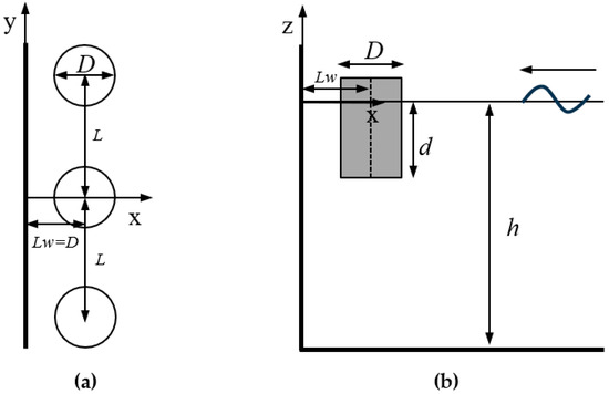 In the calculation, the prototype WECs were considered in irregular wave climates described by a JONSWAP spectrum with a significant wave height () of 3 m and peak period () of 5 s. To search for a cost-effective design of WECs, various parameters of WECs such as diameter, number of WECs, and distance between them were considered. The diameters () considered were 2 m, 3 m, and 4 m while the drafts () of WECs were selected as 5.55 m, 5.25 m, and 5 m, accordingly and mass () of 17,872 kg, 38,038 kg and 64,403 kg respectively. These drafts were chosen to tune the heave natural period of WEC to align with the peak period of the wave spectrum such that the heave motion will be maximized at the peak frequency where wave energy is concentrated. The number of WECs under consideration were 1, 3, and 5, which enabled comparison of the performance of a single WEC and multiple WECs in an array. The distance between the WEC and the vertical seawall () is fixed to be equal to the WEC’s diameter (). The WECs are deployed with a parallel layout to the seawall. The distance between WECs () is considered as two- and five-times the diameter of the WEC. These can be representative values of the minimum required distance and a sufficiently distant placement respectively [18,21]. The WECs were placed in a water depth of 10 m. Figure 7 shows a schematic sketch of different configurations of an array of WECs and key parameters with a total of 15 cases.