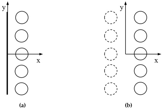 Top view of an array of (a) WECs in front of a vertical seawall and (b) WECs and image bodies denoted by a dashed line to replace the vertical seawall.