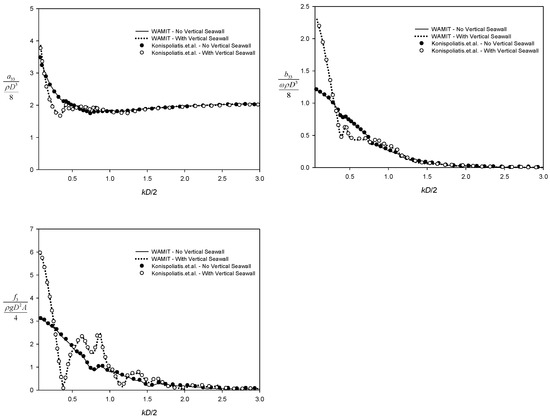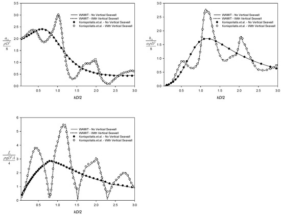 The present numerical results of hydrodynamic forces obtained from the commercial software WAMIT are compared with the published analytical results [17] for validation purposes. The WAMIT software supplies frequency-domain solutions based on the low-order panel method for the radiation and diffraction problems under linear potential theory. The hydrodynamic parameters obtained from the WAMIT were modified using the image method to consider the vertical seawall effect.