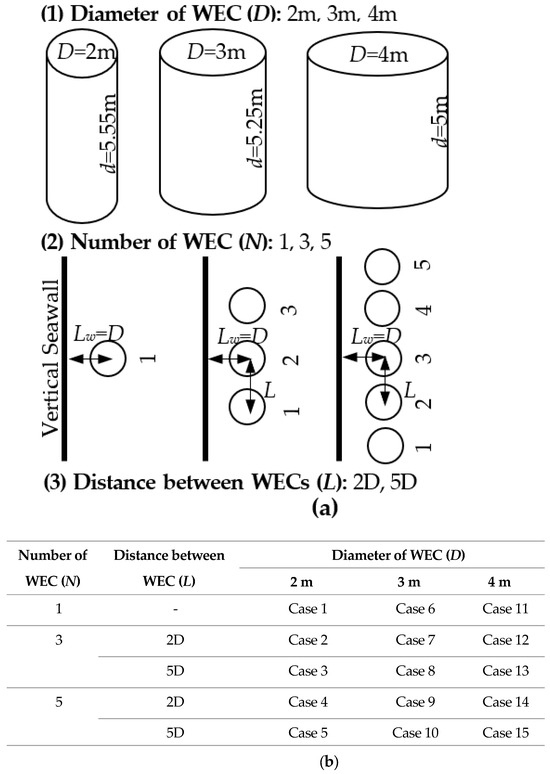 (a) Schematic sketch of different configurations of an array of WECs with various parameters such as WEC diameter, number of WECs, and spacing between WECs. (b) Various parameters in a tabular form with a total of 15 cases.